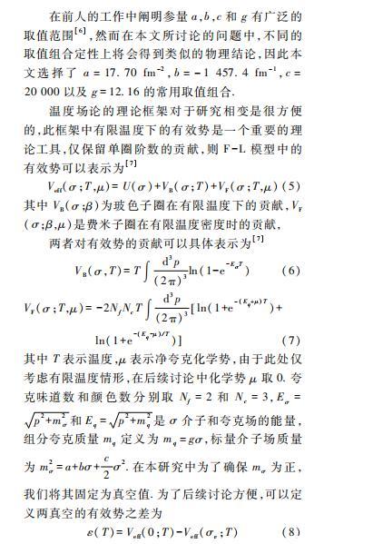以往的文獻(xiàn)中通常采用溫度場論的方法可以得到夸克系統(tǒng)的有效勢,進(jìn)一步可以得到場的動力學(xué)方程,主要討論了氣泡的動力學(xué)問題,并沒有具體討論液滴的動力學(xué)問題,本文希望同時(shí)對氣泡和液滴進(jìn)行嚴(yán)格的數(shù)值求解并對兩者加以比較,進(jìn)一步說明它們各自的性質(zhì)以及對相變可能產(chǎn)生的影響。我們也期望本文對于氣泡和液滴分析的一般研究方法和基本結(jié)果今后可以繼續(xù)推廣至同時(shí)具有手征對稱性和禁閉特征的QCD有效模型。