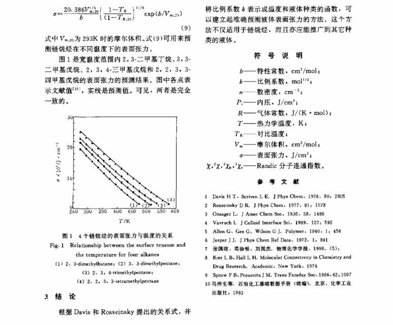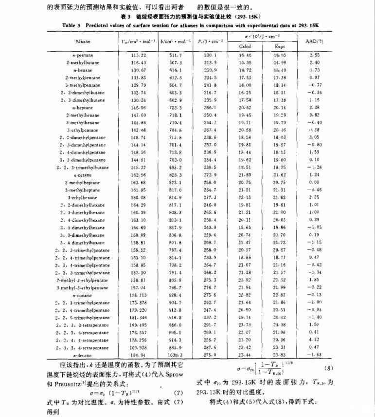 對Davis和Rosseinsky提出的關(guān)系檢驗表明,液體的表面張力σ與P1Vm1/3之比不僅取決于溫度,還與液體的種類有關(guān),據(jù)此,建立了一個能由鏈烷烴的分子結(jié)構(gòu)準確預(yù)測其表面張力的方法。