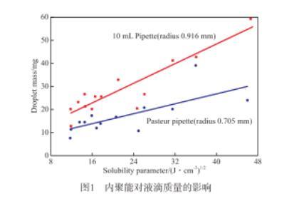 對于純物質的溶解度參數(shù)可通過文獻查閱、基團貢獻計算法和液體熱力學關系式計算。而礦物油為混合物,很難查到或者估算它的溶解度參數(shù)。文獻提供了一種溶解度參數(shù)的估算法:稱量10~20滴液體,然后計算每滴液體的平均質量;另取2種已知溶解度參數(shù)的非揮發(fā)性液體作為參照,通過做圖大致計算出液體的溶解度參數(shù)。實驗需保持恒溫。分別通過內(nèi)徑為0.916 mm的10 mL移液管和內(nèi)徑為0.705 mm的巴斯德移液管移取液滴,得到兩條溶解度參數(shù)與液滴質量的關系曲線。內(nèi)聚能對液滴質量的影響見圖1。由圖1可見,液滴的質量與液體溶解度參數(shù)成線性關系。該估算方法可用來計算混合液體的溶解度參數(shù),適用于礦物潤滑油溶解度參數(shù)的計算。雖然估算方法過于粗糙,但為估算礦物油等復雜混合物的溶解度參數(shù)提供了思路。文獻介紹了液滴的大小與液體表面張力有關。由此可見,溶解度參數(shù)與表面張力存在一定的關系。