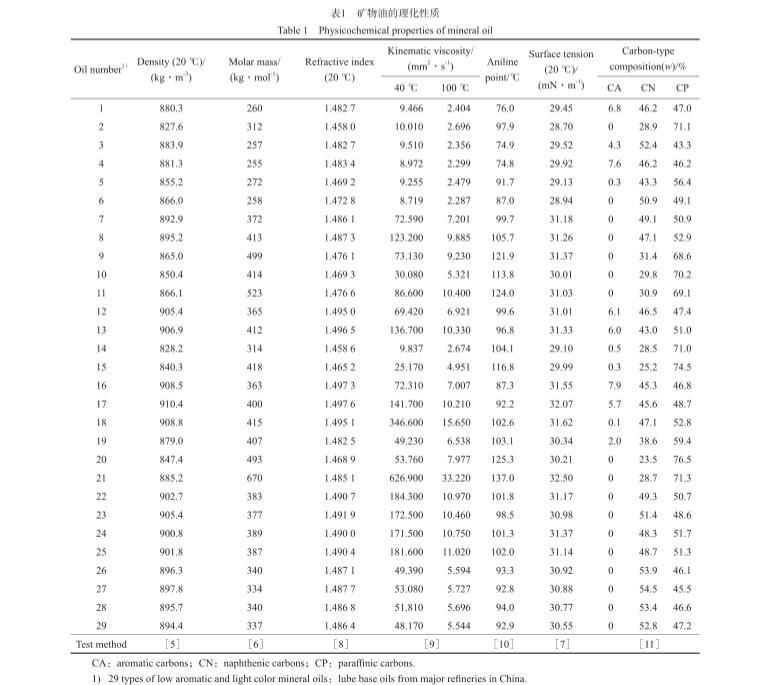 29種常見的低芳淺色礦物油:取自國內(nèi)主要煉油廠的潤滑油基礎油,包括主要的石蠟基基礎油和環(huán)烷基基礎油,不包括深色高芳烴礦物油;從精制程度看,包括高壓加氫深度精制油品,也包括溶劑精制和白土精制工藝精制油品;從碳型結構看,包括芳環(huán)碳(CA)含量為零的油品,也包括CA含量小于10%(w)的油品。礦物油的理化性質見表1。