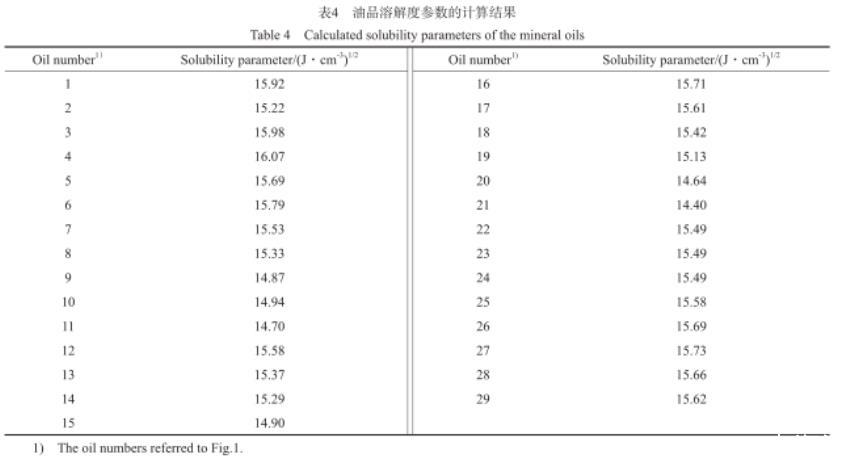 表面張力估算法測定29種常見低芳淺色礦物油的溶解度參數(shù)——結(jié)果與討論、結(jié)論