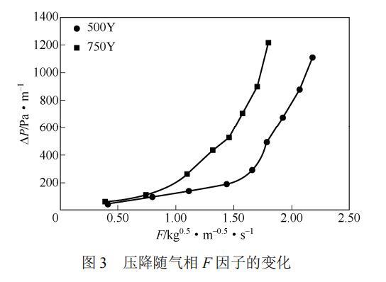 (1)在一定負(fù)荷范圍內(nèi),750Y填料的分離效率優(yōu)于500Y填料,但單位填料高度的壓降高于500Y填料,導(dǎo)致操作穩(wěn)定性比500Y填料差,處理量比500Y填料小。