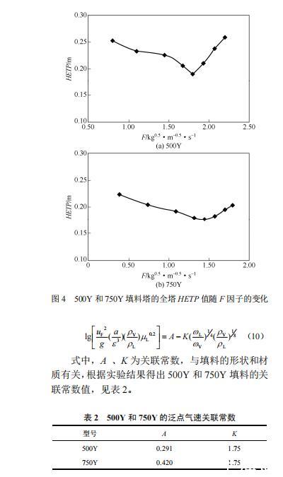 (2)實驗測定了氣相負(fù)荷從小到大直至液泛的流體力學(xué)性能和傳質(zhì)性能,得到了液泛時的實驗數(shù)據(jù),給定了操作的極限。500Y規(guī)整填料塔的最大F因子Fmax=1.8kg0.5/(m0.5·s);750Y規(guī)整填料塔的最大F因子Fmax=1.5kg0.5/(m0.5·s)。對于正庚烷-甲基環(huán)己烷物系,500Y填料的泛點氣速為uF=0.98m/s,750Y填料的泛點氣速為uF=0.82m/s。并由實驗結(jié)果擬合出貝恩(Bain)-霍根(Hougen)關(guān)聯(lián)式中常數(shù)A、K的值。對于500Y填料A=0.291,K=1.75;對于750Y填料A=0.420,K=1.75。