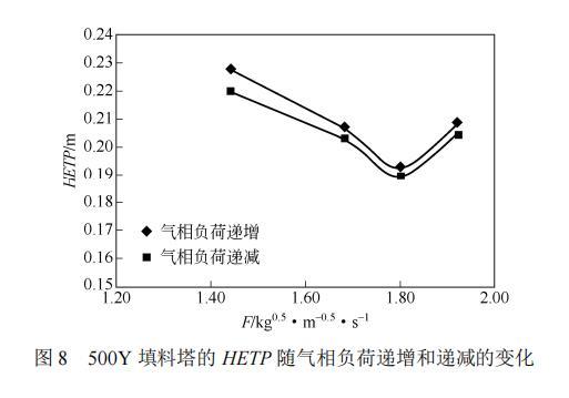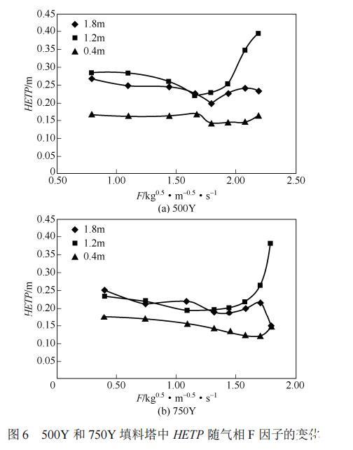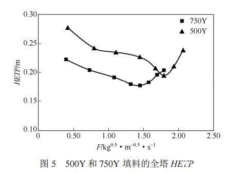 圖5表示500Y和750Y填料塔HETP值隨氣相F因子的變化。由圖5可以看出,泛點以下,兩種填料的HETP隨氣相F因子的增大而減小,即傳質(zhì)效率隨氣液相負(fù)荷的增加而升高;泛點以上,兩種填料的HETP隨氣相F因子的增大而增大,即傳質(zhì)效率隨氣液相負(fù)荷的增加而降低。這是因為泛點以下,隨氣相負(fù)荷的增大,氣相傳質(zhì)系數(shù)和傳質(zhì)界面積均增大。全回流條件下,液相流速和氣相流速變化一致,氣相負(fù)荷增大時,液相負(fù)荷也增加,大液量提高了填料的潤濕率,增加了有效傳質(zhì)界面積;另一方面高氣速增加了液膜的湍動,也會增加有效傳質(zhì)界面積。