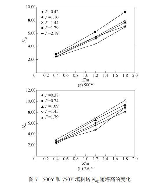 圖7為500Y和750Y填料塔中Nog隨塔高的變化。由圖7(a)可以看出,大多數(shù)情況下500Y填料塔中Nog隨塔高的變化為一條直線,即總體積傳質(zhì)系數(shù)沿塔高不發(fā)生變化。這是因為在適宜的操作范圍內(nèi),塔內(nèi)流動狀態(tài)比較穩(wěn)定,氣相負(fù)荷一定時,氣相傳質(zhì)系數(shù)不變。正庚烷-甲基環(huán)己烷為純有機(jī)物系,表面張力中性體系,塔內(nèi)形成的微弱的正表面張力梯度有利于液膜的穩(wěn)定,從而使有效傳質(zhì)面積保持恒定。由此可以推測,對有機(jī)負(fù)體系而言,負(fù)的表面張力梯度會引起液膜沿流動方向不斷破碎,造成有效傳質(zhì)面積的減小,因此Kya隨塔高下降不斷降低。這與耿皎等[18]在直徑為30mm的玻璃精餾塔中選用正體系庚烷-甲苯和負(fù)體系苯-庚烷的精餾實驗得到的結(jié)論一致。從圖7(a)可得當(dāng)氣相負(fù)荷過小或過大時,500Y填料塔中Nog隨塔高的變化并不是一條直線,這說明總體積傳質(zhì)系數(shù)Kya沿塔高發(fā)生變化。當(dāng)氣相負(fù)荷很小時,總體積傳質(zhì)系數(shù)Kya沿氣相流動方向減小;當(dāng)氣相負(fù)荷很大時,總體積傳質(zhì)系數(shù)Kya沿液相流動方向減小。當(dāng)流體流量過高或過低時,塔內(nèi)流動狀態(tài)極不穩(wěn)定,過低的氣相負(fù)荷,使氣相傳質(zhì)系數(shù)沿氣相流動方向減小、氣液相接觸減弱,即表現(xiàn)為總體積傳質(zhì)系數(shù)Kya隨塔高增加而減小;而過大的氣相負(fù)荷,引起液泛,液體積聚在塔上部很難流下,使沿液相流動方向液相傳質(zhì)系數(shù)減小、氣液相接觸減弱,即表現(xiàn)為總體積傳質(zhì)系數(shù)Kya隨塔高降低而減小。對比圖7(a)和7(b)可得,750Y填料塔中總體積傳質(zhì)系數(shù)Kya隨塔高的變化規(guī)律與500Y填料塔一致。