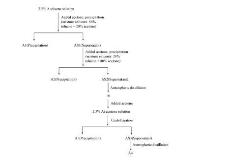 1.2.1瀝青質(zhì)及其亞組分的分離利用正己烷沉淀出原油中的瀝青質(zhì)A.利用混合溶劑(甲苯和丙酮)沉淀法,將A分為4個(gè)不同的亞組分,分離流程如Scheme 1所示。首先,制備質(zhì)量分?jǐn)?shù)為2.5%的A甲苯溶液,作為初始瀝青質(zhì)溶液,然后加入丙酮,將該混合物(甲苯/瀝青質(zhì)/丙酮)靜置20 h后,以3500 r/min的轉(zhuǎn)速離心40 min,分別收集瀝青質(zhì)的第1個(gè)亞組分A1和上清液AS1.在AS1中繼續(xù)加入丙酮至濃度為80%,離心沉淀,分別收集瀝青質(zhì)的第2個(gè)亞組分A2和上清液AS2.通過(guò)常壓蒸餾去除AS2中的溶劑,得到瀝青質(zhì)的中間亞組分Ai.將Ai以質(zhì)量分?jǐn)?shù)為2.5%的濃度溶于丙酮,靜置20 h后,離心40 min得到瀝青質(zhì)的第3個(gè)亞組分A3和上清液AS3,然后通過(guò)常壓蒸餾去除AS3中的溶劑得到瀝青質(zhì)的第4個(gè)亞組分A4.
