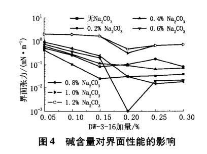 三元復(fù)合驅(qū)中注入堿能引起地層黏土分散、運(yùn)移,導(dǎo)致地層滲透率下降,堿與油層流體及巖石礦物反應(yīng),可形成堿垢,對(duì)地層造成傷害,會(huì)引起油井結(jié)垢,影響油井正常生產(chǎn);加入堿能大幅降低聚合物的黏彈性。因此,堿對(duì)DW-3-16表面活性劑性能的影響至關(guān)重要。