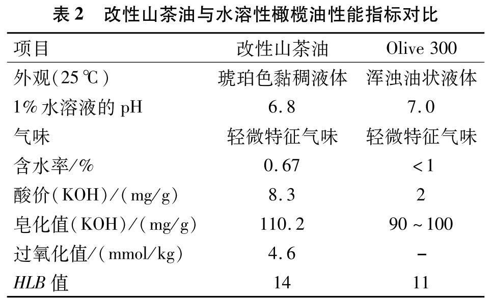 改性山茶油與水溶性橄欖油(Olive 300)的各項性能指標(biāo)如表2所示。