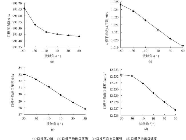 在表面張力系數(shù)為50N/mm不變時,接觸角取值:-50°~50°。得到口模壓力降、口模平均進(jìn)出口壓力、以及口模出口平均速度曲線如圖8所示。由圖8可知,接觸角與口模流場參數(shù)的關(guān)系并不是線性關(guān)系。由圖6可知接觸角θ增大,自由表面擠出脹大比值減小,φ減小,表面張力對口模出口處的軸向分力如式(9)所示,牽引力隨著夾角φ值的減小而增大,使得材料在口模內(nèi)的剪切能量損失減小,因此壓力降減小。所以圖8(a)中口模平均進(jìn)出口壓力降減小。而圖8(b)、(c)中口模內(nèi)熔體進(jìn)出口壓強(qiáng)的減小是因為擠出脹大減小,自由表面對外做功減小,自由表面對口模的阻力減小。圖8(d)中口模平均出口速度減小是因為表面張力對自由表面的徑向分力減小,口模內(nèi)熔體出口徑向速度減小,而熔體軸向速度不變,因此平均速度減小。