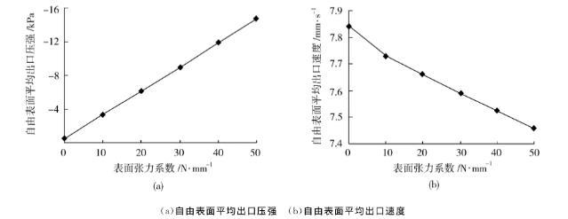 圖9表面張力系數(shù)對自由表面出口壓強(qiáng)與速度的影響