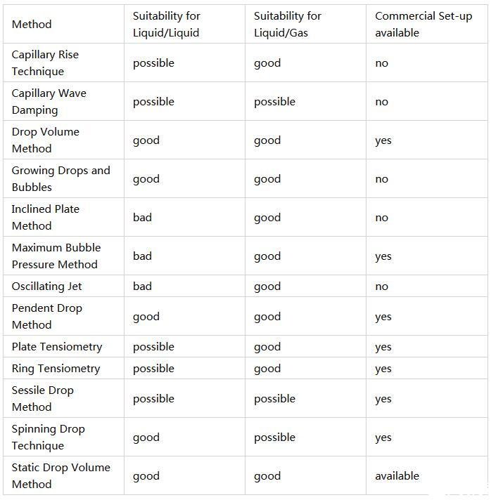 為了克服這個(gè)問(wèn)題,Joos提出了一個(gè)理論,將動(dòng)態(tài)方法的數(shù)據(jù)減少到所謂的界面有效壽命,相當(dāng)于靜態(tài)界面達(dá)到吸附狀態(tài)所需的時(shí)間。這樣就可以直接比較所有實(shí)驗(yàn)技術(shù)的測(cè)量結(jié)果。每種方法都有優(yōu)點(diǎn)和缺點(diǎn)。