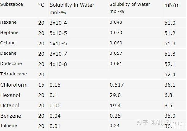 下表給出了兩種液體之間的界面張力值,兩種液體都是相互飽和的,以避免物質(zhì)通過(guò)界面轉(zhuǎn)移造成的影響。注意,所有液體在第二種液體中都有一定的溶解度。室溫下的溶解度極限也在表3中給出。