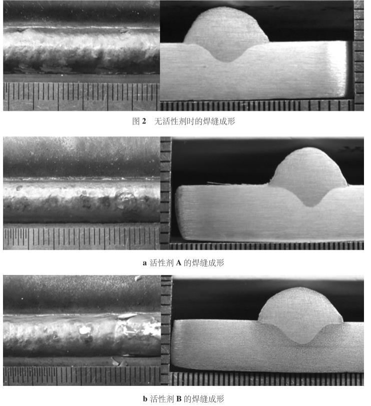 試驗前先將試樣除銹,用角磨機打磨,再用酒精或丙酮擦拭,去除油污及其他雜質。然后稱取一定量的活性劑,用乳化劑酒精進行充分乳化,調配攪拌成糊狀。用扁平毛刷將活性劑涂于工件待焊位置寬20 mm的區(qū)域,活性劑涂覆厚度以覆蓋金屬表面光澤為宜。最后在如表1所示的同一焊接參數(shù)下進行焊接試驗。觀察焊接現(xiàn)象,用RCU5000i外加存儲卡記錄焊接過程參數(shù)變化;焊后觀察焊縫的宏觀成形,并記錄結果;將試驗所得焊縫沿距尾部30mm的距離進行切割,然后打磨、拋光、腐蝕和觀察金相,記錄焊縫的熔深、熔寬等焊縫參數(shù),計算焊縫的熔深比等。