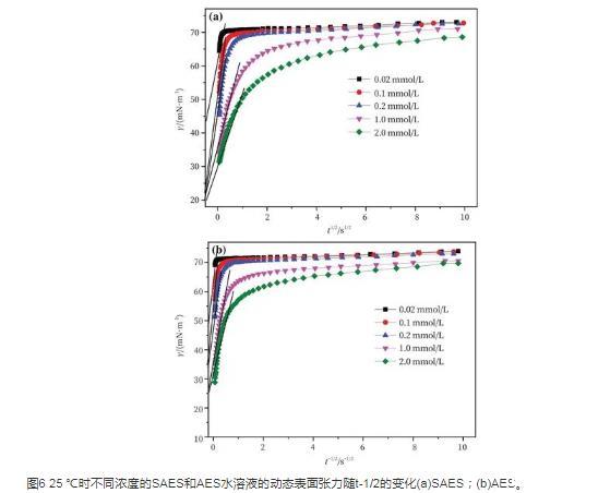 從圖4可以看出所測不同濃度不同表面活性劑的表面張力在初始階段均快速下降,一定時間后趨于平穩(wěn)狀態(tài)。這是因為動態(tài)表面張力測試過程中新形成的表面遠偏離于平衡態(tài),吸附層離子的濃度很低,體相與吸附層的濃度差大,因此動態(tài)表面張力變化很大。隨著吸附的進行,次表面濃度和表面濃度逐漸增大,擴散和吸附的速度均逐漸降低,動態(tài)表面張力隨著吸附時間的增加而降低的趨勢也逐漸變得平緩。當(dāng)表面活性劑濃度增大時,表面張力的下降幅度和速度也隨之增大,而且相應(yīng)地縮短了到達平衡狀態(tài)的時間。這種隨體系濃度的增加達到平衡所需的時間越短的趨勢與已經(jīng)報道的一些烷基表面活性劑的結(jié)果是相一致的。在相同濃度下,SAES表面張力下降的速率大于AES,這是由于SO4-在碳氫鏈中間的化合物比在端點者擴散速度快。
