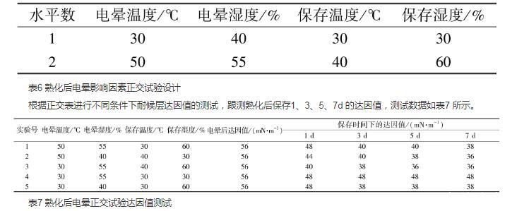 本文通過JMP軟件定制熟化前后電暈正交試驗設(shè)計,發(fā)現(xiàn)熟化溫度影響最顯著,熟化環(huán)境的濕度對耐候?qū)颖砻鎻埩τ绊懙诙@著,反應(yīng)程度第三顯著,電暈溫度無明顯影響。在40℃條件下,對熟化濕度進行單因素分析,控制熟化濕度低于40%,基本上能使耐候?qū)颖砻鎻埩_到38 mN/m。熟化后電暈與熟化前電暈相比,在相同的保存時間內(nèi),熟化后電暈達因值較大。