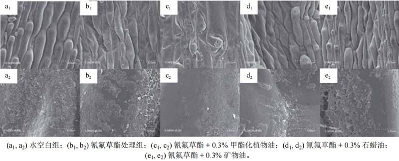 通過掃描電鏡觀察稗草葉片結(jié)構(gòu)變化探究了油類助劑對氰氟草酯防除稗草的增效作用。作者分別對比了純水、氰氟草酯處理和添加油類助劑的氰氟草酯處理后的稗草葉片結(jié)構(gòu),發(fā)現(xiàn)水對稗草葉表面的蠟質(zhì)層和表皮細(xì)胞沒有任何影響(圖1a1,a2),氰氟草酯使表皮細(xì)胞略有萎縮(圖1b1),溶解了少量的表皮蠟質(zhì)層(圖1b2),而添加油類助劑后均發(fā)生表皮細(xì)胞變窄萎縮和蠟質(zhì)層溶解的現(xiàn)象(圖1c1-e2)。其中,石蠟油和礦物油能使表皮細(xì)胞變窄變小,水分減少(圖1d1,e1),溶解大約30%的表皮蠟質(zhì)(圖1d2,e2)。甲酯化植物油(MSO)能較大程度地使表皮細(xì)胞萎縮(圖1c1),溶解超過50%的蠟質(zhì)層(圖1c2)。正是因?yàn)镸SO(體積分?jǐn)?shù)0.5%)溶解了大量稗草葉片的表皮蠟質(zhì)層,嚴(yán)重破壞了葉片的角質(zhì)層,從而極大地增強(qiáng)了稗草葉片對氰氟草酯的滲透和吸收能力,使其對氰氟草酯防除稗草的防效提高了78.7%。