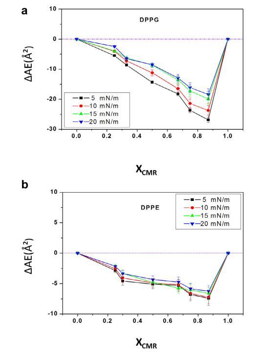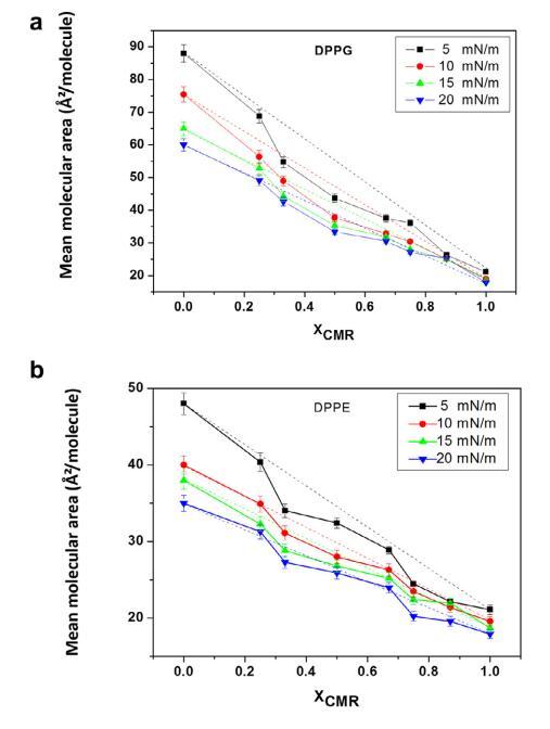 分子面積作為 CMR/ DPPG如圖5a所示。 可以看出負偏差 mma (XCMR = 0.33–0.67) 由于分子吸引力相互作用的增加。 CMR/DPPG 薄膜被認為是部分混溶和非理想的浮動單層,因為線性度不高 觀察到的。 CMR/DPPE 混合薄膜的結(jié)果在 XCMR=0.25 和 0.67 時表現(xiàn)出不同的斷裂點(圖 5b)。 DAE 節(jié)目 包裝效率甚至幾何形狀的改進 調(diào)節(jié)發(fā)生在較低的 XCMR(圖 6)(Andrade 等人, 2006; 周和張,2000)。
