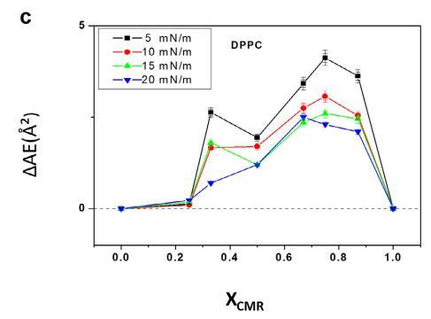 純和混合單層的 pA 等溫線與分子面積的關(guān)系如圖 1 所示。CMR/DPPG 等溫線顯示出與純 DPPG 脂質(zhì)相似的趨勢(圖 1a)。 相似相 對所有 CMR/DPPG 混合物都觀察到了轉(zhuǎn)變。 DPPG 和 DPPC 顯示崩潰壓力 (DPcoll) 為 52 mN.m-1 次方和 60 mN.m-1次方 , 分別。 一個過渡 (p ffi 3 mN.m-1次方 ) 從液體 發(fā)現(xiàn)純 DPPE 單層膨脹為凝聚相 與 D. coll 在 ffi55 mN.m-1次方 . 為 D. coll 獲得的值 純脂質(zhì)與文獻一致(Vollhardt 等人, 2000; 諾沃塔斯卡等人,2014 年)。