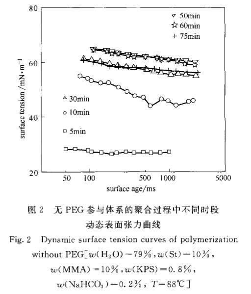 2.2聚合時(shí)間對(duì)動(dòng)態(tài)表面張力變化趨勢(shì)的影響經(jīng)引發(fā),水相中溶解的單體聚合成鏈,聚合體系的組分也隨之發(fā)生變化。體系在水相中含有了自由基齊聚物,以及由齊聚物聚集形成的基本粒子或膠束。這些新產(chǎn)生的物質(zhì)對(duì)DST曲線有很明顯的影響,加上PEG與聚合物鏈的相互作用,則使DST曲線有更多的變化。為了能明確地分析PEG在聚合過程中的作用,進(jìn)行了有PEG和無PEG參與的聚合體系各時(shí)間段動(dòng)態(tài)表面張力實(shí)驗(yàn)比較。圖2和圖3分別為St/MMA在無PEG的水中和有PEG的水溶液中DST隨聚合時(shí)間的變化趨勢(shì)。