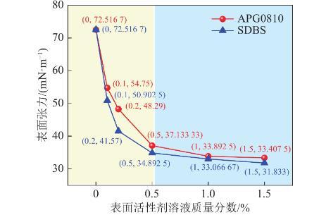 相同質(zhì)量分?jǐn)?shù)下,SDBS溶液表面張力普遍比APG0810溶液低。在表面活性劑溶液質(zhì)量分?jǐn)?shù)為0.01%、0.02%、0.05%時(shí),SDBS分別較APG0810溶液低7.03%、13.92%、6.03%。這是由于APG0810為非離子表面活性劑,在水中不電離出離子,SDBS為陰離子表面活性劑,在水中電離出陰離子,同種電荷間斥力在宏觀上表現(xiàn)出表面張力低的現(xiàn)象。