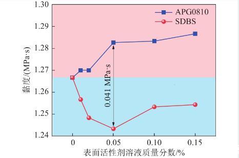 在質(zhì)量分?jǐn)?shù)為0.05%時(shí)兩種表面活性劑溶液黏度相差0.041 MPa·s,達(dá)到最大值,這是由于在該質(zhì)量分?jǐn)?shù)下SDBS溶液未形成膠束,且離子之間斥力最大,而APG0810溶液開始形成膠束,溶液內(nèi)分子間碰撞概率變大。