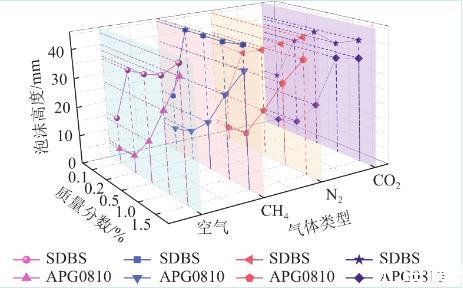 對(duì)比同一種溶液通入不同氣體的高度進(jìn)行分析,空氣、氮?dú)饧岸趸甲⑷胍后w發(fā)泡性規(guī)律基本一致,均在質(zhì)量分?jǐn)?shù)最高時(shí)發(fā)泡率達(dá)到最大。通入甲烷時(shí)則在SDBS溶液質(zhì)量分?jǐn)?shù)為0.02%時(shí)就達(dá)到了與0.15%接近的發(fā)泡高度。APG0810在甲烷注入時(shí)也比其他氣體總體發(fā)泡率高,這是由于甲烷的摩爾質(zhì)量最低,氣體密度低,分子擴(kuò)散快,泡沫膨脹速率變快導(dǎo)致的。