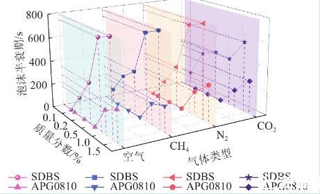 空氣、甲烷及氮?dú)獾姆€(wěn)泡性規(guī)律大致相同,注入空氣情況下,SDBS溶液質(zhì)量分?jǐn)?shù)為0.15%時(shí)泡沫半衰期約為786.5 s,二氧化碳注入液體的穩(wěn)泡性明顯下降,質(zhì)量分?jǐn)?shù)為0.15%時(shí)為584 s,比空氣低202.5 s。推測(cè)這是由于二氧化碳為酸性氣體,表面活性溶液在酸性環(huán)境下泡沫穩(wěn)定性不足,泡沫液膜強(qiáng)度不易控制酸性氣體造成的。而APG0810表面活性劑溶液泡沫半衰期在四種氣體注入情況下差異不明顯,是由于APG0810為非離子表面活性劑,在溶液中不是以離子狀態(tài)存在,由此可以推出它的穩(wěn)定性高,不易受強(qiáng)電解質(zhì)影響,也不易受酸、堿影響。