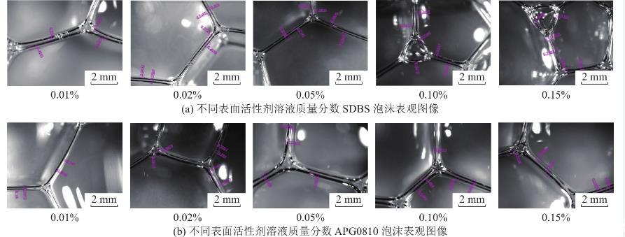 根據(jù)以上試驗(yàn)結(jié)果可以獲得,溶液表面張力越小,則溶液發(fā)泡性能越好,溶液表面張力與發(fā)泡特性有較明顯相關(guān)性,而溶液黏度與泡沫性質(zhì)相關(guān)性不顯著。APG0810溶液黏度隨質(zhì)量分?jǐn)?shù)增加而增加,發(fā)泡性及泡沫穩(wěn)定性也逐漸增加,而SDBS溶液黏度先隨著溶液質(zhì)量分?jǐn)?shù)增加而降低,濃度較大時(shí)有上升趨勢(shì),溶液發(fā)泡性及泡沫穩(wěn)定性呈現(xiàn)逐漸增加趨勢(shì),且發(fā)泡性與泡沫穩(wěn)定性均優(yōu)于APG0810溶液。