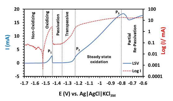 圖1電化學(xué)線性掃描伏安圖(LSV,藍(lán)色實(shí)線)及液滴電流的對(duì)數(shù)圖(紅色虛線),針對(duì)1 M NaOH中的鎵銦合金,掃描速率為0.5 mV/s。垂直虛線將圖中標(biāo)記的六個(gè)反應(yīng)區(qū)域區(qū)分開來,標(biāo)記出三個(gè)氧化峰P1、P2和P3。