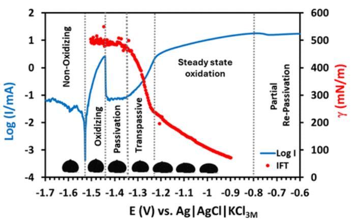 再鈍化階段:在更高電位下,表面部分重新鈍化,表面張力略有回升,液滴變形的趨勢(shì)得到一定抑制,推測(cè)是表面形成了新的氧化層薄膜。