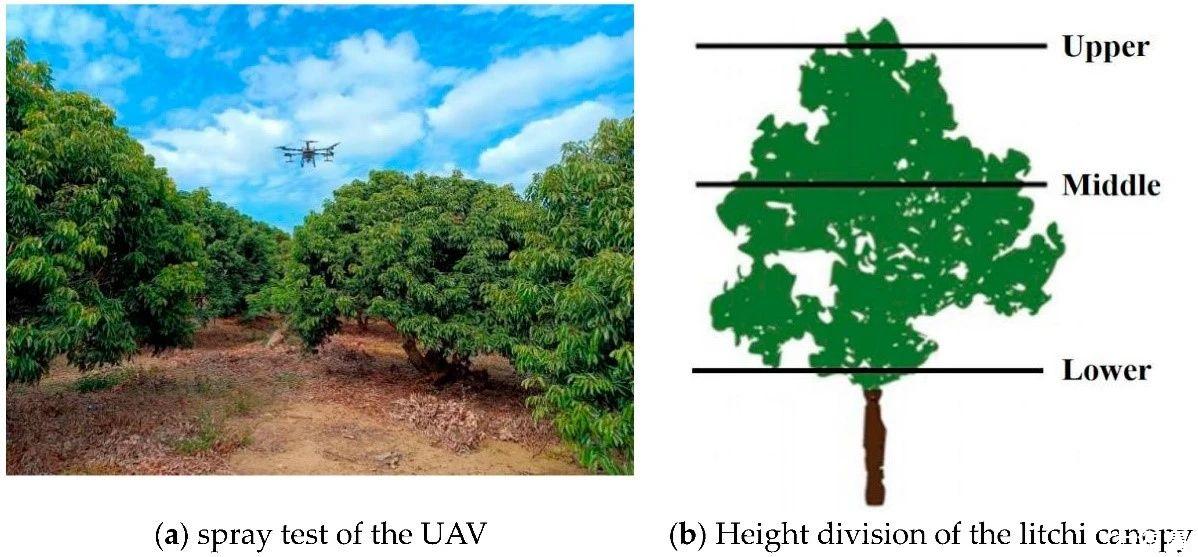 圖1.T30植保無(wú)人機(jī)噴霧機(jī)在荔枝園噴霧沉積測(cè)量。