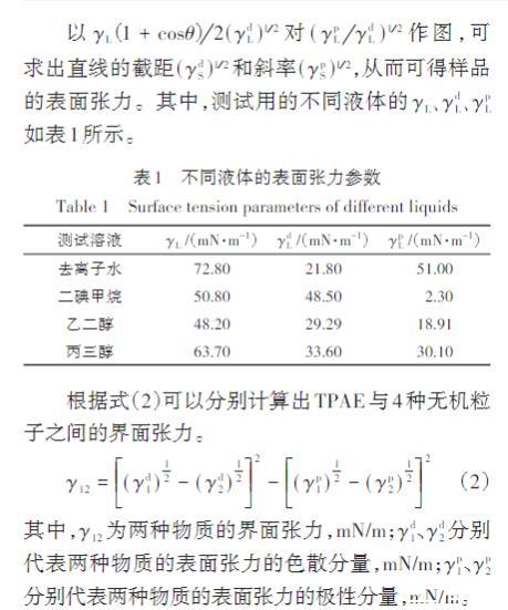 界面張力測(cè)試用模壓機(jī)將TPAE制成1 mm厚的薄片,再用紅外制樣機(jī)將4種無(wú)機(jī)粒子在大于10 t的壓力下制成1 mm厚的圓形薄片。利用光學(xué)法接觸角儀測(cè)試出TPAE、Talc、CaSiO3、CaCO3、WI分別與去離子水、二碘甲烷、乙二醇、丙三醇等多種測(cè)試溶液的接觸角值θ,每組樣品至少測(cè)量3次,測(cè)試結(jié)果取均值。
