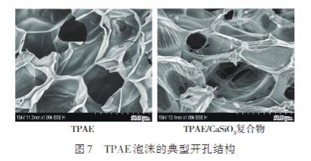 根據(jù)TPAE/無機粒子復(fù)合物泡沫的泡孔結(jié)構(gòu)圖可以看出,相比較于純TPAE泡沫的閉孔結(jié)構(gòu),無機粒子的添加明顯促進了TPAE泡沫泡孔的打開。為詳細探究無機粒子的開孔機制,使用真密度儀對不同TPAE/無機粒子復(fù)合物泡沫的開孔率進行了測試,如圖6所示。無機粒子的添加都提高了TPAE泡沫的開孔率,表明無機粒子的加入是影響開孔率的關(guān)鍵因素。基于TPAE和TPAE/CaSiO3復(fù)合物泡沫中的開孔結(jié)構(gòu)分析無機粒子對復(fù)合物泡沫開孔結(jié)構(gòu)的影響(以CaSiO3為例),如圖7所示??梢钥闯觯僒PAE泡沫主要出現(xiàn)泡孔壁上,且形成的孔比較規(guī)則,這是由于純TPAE熔體強度低,泡孔壁容易破裂。而TPAE/CaSiO3復(fù)合物泡沫的開孔主要發(fā)生在泡孔的內(nèi)壁以及幾個泡孔的相交處上,這是因為在泡孔生長過程中,由于CaSiO3的非均相成核,泡孔在CaSiO3分散相周圍成核生長,形成花狀的泡孔結(jié)構(gòu),而TPAE與無機粒子的相容性差,使得CaSiO3從泡孔壁上脫落,留下不規(guī)則的網(wǎng)狀結(jié)構(gòu),從而導(dǎo)致泡孔間相互連接。其他3種TPAE/無機粒子復(fù)合物泡沫的開孔形式同TPAE/CaSiO3復(fù)合物泡沫一致。圖8展示了兩種與TPAE具有不同界面張力的粒子(以CaSiO3和Talc為例)的添加對復(fù)合物泡沫開孔結(jié)構(gòu)形成的影響機制。