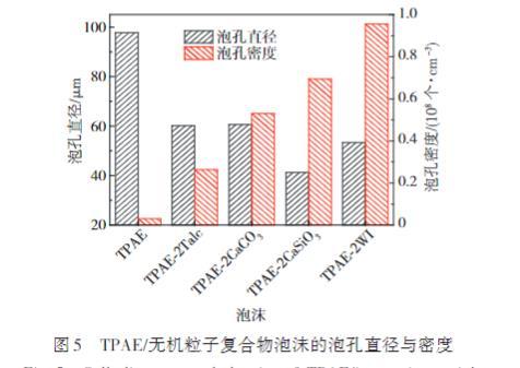 圖5 TPAE/無機粒子復(fù)合物泡沫的泡孔直徑與密度