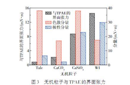 相比之下,CaSiO3與TPAE、WI與TPAE的界面張力分別達到8.72 mN/m和14.5 mN/m,大約為Talc的10~15倍,高界面張力通常導(dǎo)致物質(zhì)間的相分離,表明CaSiO3和WI與TPAE之間存在明顯的不相容。而CaCO3與TPAE的界面張力雖低于CaSiO3和WI,但仍高于Talc,表明CaCO3與TPAE的相容性位于中間。
