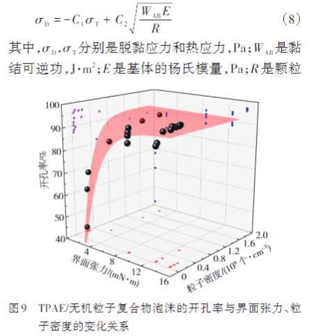式(8)揭示了起始脫黏應(yīng)力受到粒子與基體間黏接強(qiáng)度(即界面張力)、楊氏模量以及顆粒尺寸的共同影響。隨著顆粒尺寸和界面張力的增加,脫黏所需的起始應(yīng)力降低,導(dǎo)致由顆粒脫黏引發(fā)的空隙會隨著更高的泡孔壁的拉伸變形速率而增加。對于TPAE/CaCO3、TPAE/CaSiO3及TPAE/WI這3種復(fù)合物,由于其較高的界面張力或較大的粒子直徑,促使分散相從TPAE基體中的脫落更為容易,較高的粒子密度導(dǎo)致異相成核位點(diǎn)增多,進(jìn)而顯著提升泡孔密度和減少泡孔壁厚,泡沫生長過程中拉伸應(yīng)變速率的提高使泡孔壁所承受的拉伸應(yīng)力增大,從而導(dǎo)致復(fù)合物泡沫的開孔率進(jìn)一步增加。其中,TPAE/WI復(fù)合物因在界面張力以及粒子分布密度上的雙重優(yōu)勢而具有最高的開孔率。