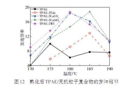 圖12展示了4種TPAE/無機(jī)粒子泡沫熟化后的發(fā)泡倍率隨溫度變化的情況。結(jié)果表明,相較于純TPAE,4種復(fù)合物泡沫的最終發(fā)泡倍率均有所增加,其中TPAE/CaCO3、TPAE/CaSiO3及TPAE/WI顯著提升。已知影響發(fā)泡倍率的主要因素有發(fā)泡劑的溶解度和聚合物的流變性能。由于無機(jī)粒子的添加量較少,基本不會影響CO2在復(fù)合物中的溶解度及流變性能。因此TPAE/無機(jī)粒子復(fù)合物的初始發(fā)泡倍率與純TPAE基本一致,但無機(jī)粒子的添加會促進(jìn)TPAE形成開孔結(jié)構(gòu),尤其是CaCO3、CaSiO3以及WI可使TPAE形成高開孔率的泡沫,減小了泡沫的收縮,使得完全熟化后的發(fā)泡倍率遠(yuǎn)高于TPAE,大大提高了TPAE的發(fā)泡性能。