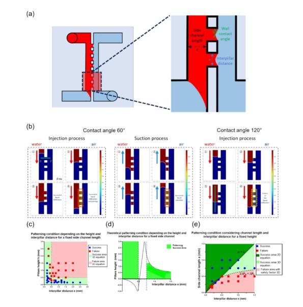 圖2展示了用于模擬液體填充和圖案化條件的數(shù)值模擬和實驗驗證,進(jìn)一步分析了在微流體平臺中實現(xiàn)毛細(xì)釘扎過程的成功條件。圖2a展示了與圖案化成功條件相關(guān)的物理參數(shù),包括柱子的高度、間距和側(cè)通道的長度。通過這些參數(shù)的控制,可以預(yù)測液體在微柱之間的保留情況。圖2b展示了液體填充過程的數(shù)值模擬,包括在不同接觸角(例如60°和120°)條件下的液體流動和釘扎效果。模擬結(jié)果顯示了如何通過改變接觸角和壓力控制液體在微柱之間的流動和停留。圖2b的模擬驗證了在較大接觸角下液體被釘扎在微柱邊緣的效果。圖2c至2e總結(jié)了不同微柱高度、間距和側(cè)通道長度對液體保留過程的影響,通過這些參數(shù)優(yōu)化可實現(xiàn)液體在微柱之間的穩(wěn)定釘扎,適用于后續(xù)的細(xì)胞培養(yǎng)實驗。