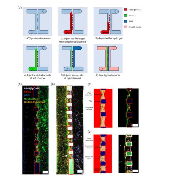 圖3通過細(xì)胞加載流程示意圖和熒光圖像,展示了微流體平臺在再現(xiàn)肺泡三維微環(huán)境方面的有效性。圖3a展示了細(xì)胞加載的步驟,包括在水凝膠薄膜兩側(cè)加入不同類型的細(xì)胞,以創(chuàng)建多層細(xì)胞結(jié)構(gòu)。圖3b和3c展示了微流體平臺上與內(nèi)皮細(xì)胞和肺成纖維細(xì)胞的共培養(yǎng)熒光圖像。水凝膠薄膜中含有橙色染色的成纖維細(xì)胞,水凝膠膜側(cè)面綠色層表示生長的內(nèi)皮細(xì)胞層。這種結(jié)構(gòu)模擬了肺部的基質(zhì)和內(nèi)皮層,為后續(xù)肺部疾病研究提供了生理相關(guān)的模型。圖3d和3e分別展示了細(xì)胞配置的示意圖和最大投影的共聚焦顯微圖像。在這些圖中可以看到肺成纖維細(xì)胞(橙色)和內(nèi)皮細(xì)胞(綠色)在水凝膠薄膜的不同層次的分布情況,形成了一個三維的細(xì)胞共培養(yǎng)環(huán)境。圖像還顯示,細(xì)胞在培養(yǎng)過程中保持了較高的活力,并成功地在水凝膠薄膜周圍形成了均勻的細(xì)胞層。