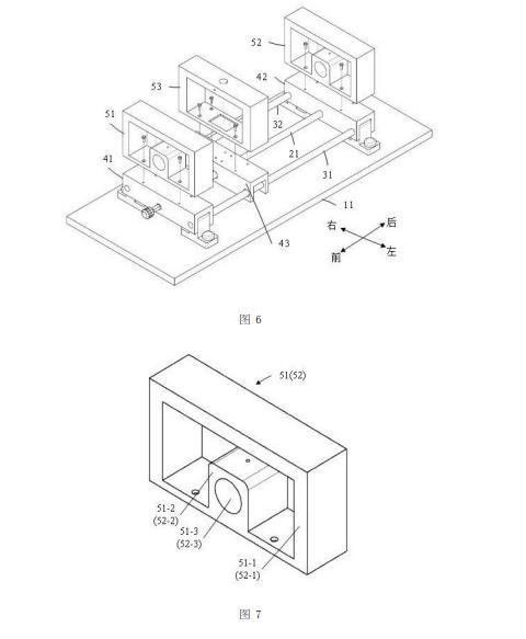 第一導(dǎo)桿31從前往后依次穿過第一左通孔41-1、第三左通孔43-1、以及第二左通孔42-1,第一導(dǎo)桿31的前端與第一左通孔41-1固定連接,第一導(dǎo)桿31的后端與第二左通孔42-1固定連接;第二導(dǎo)桿32從前往后依次穿過第一右通孔41-2、第三右通孔43-2、以及第二右通孔42-2,第二導(dǎo)桿32的前端與第一右通孔41-2固定連接,第二導(dǎo)桿32的后端與第二右通孔42-2固定連接。第一絲桿21從前往后依次穿過第一中間通孔41-3、第三中間通孔43-3、以及第二中間通孔42-3。