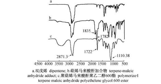 工業(yè)雙戊烯中除了百分之十左右的α-松油烯具有共軛雙鍵能直接與馬來酸酐發(fā)生D-A加成反應(yīng)外,γ-松油烯、雙戊烯等均需在催化劑作用下發(fā)生異構(gòu)化,轉(zhuǎn)化為以α-松油烯為主的含有共軛雙鍵的單環(huán)單萜才能與馬來酸酐發(fā)生反應(yīng)生成萜烯馬來酸酐加合物,萜烯馬來酸酐加合物再分別與聚乙二醇(400,600,1 000,2 000,4 000)進(jìn)行反應(yīng)得到對應(yīng)的目標(biāo)產(chǎn)物,分別為聚萜烯馬來酸酐聚乙二醇400酯(Ⅰ),聚萜烯馬來酸酐聚乙二醇600酯(Ⅱ),聚萜烯馬來酸酐聚乙二醇1000酯(Ⅲ),聚萜烯馬來酸酐聚乙二醇2000酯(Ⅳ)和聚萜烯馬來酸酐聚乙二醇4000酯(Ⅴ)。