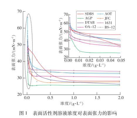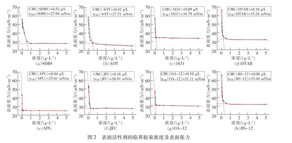 由圖2可見,8種表面活性劑溶液表面張力隨濃度變化的趨勢大體上相同,但其臨界膠束濃度及表面張力有較大差別。溶液臨界膠束濃度越小,說明表面活性劑分子在溶液中形成膠束的能力越強。8種表面活性劑的臨界膠束濃度主要集中在濃度為0.1~0.4 g/L左右,其中APG的臨界膠束濃度最小為0.04 g/L,SDBS的最大為0.53 g/L,8種表面活性劑形成膠束能力由強到弱排序為:APG>BS-12>1631>OA-12>JFC>DTAB>AOT>SDBS,總體呈現(xiàn)出兩性型>非離子型>陽離子型>陰離子型的規(guī)律。溶液的γcmc值越小,表面活性劑降低表面張力的能力越強,陰離子和非離子型的4種表面活性劑γcmc值均較低,其中APG降低表面張力能力最強,γcmc值僅為25.61 mN/m,比水降低了65.15%。而陽離子和兩性型的表面張力較高,均在31.00 mN/m以上,1631降低表面張力的能力最弱,表面張力為34.79 mN/m。8種表面活性劑降低表面張力的能力由強到弱依次排序如下:APG>JFC>AOT>SDBS>OA-12>CTAB>BS-12>1631,總體而言,非離子型>陰離子型>兩性型>陽離子型。APG的臨界膠束濃度和表面張力都最低,這可能是因為APG分子為環(huán)狀結構,環(huán)狀結構的碳原子上連接有醇羥基,這些醇羥基與水分子之間存在強相互作用,且在水溶液中溶解度很高,因此有效降低了溶液的表面張力,也更易形成膠束。