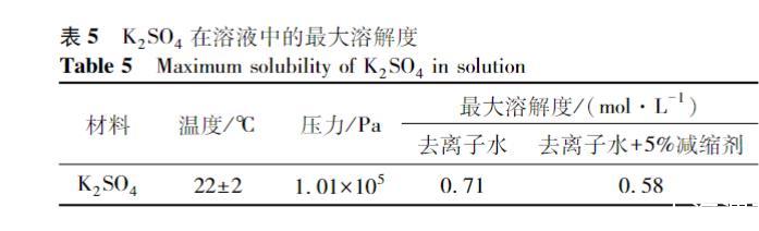 表5列出了K2SO4的最大溶解度。結(jié)果表明,SRA確實(shí)會(huì)降低K2SO4的最大溶解度。但是,對比圖5可以發(fā)現(xiàn),漿體孔溶液中的K+和SO42-的濃度還遠(yuǎn)遠(yuǎn)未達(dá)到K2SO4的最大溶解度。因此,并不能依據(jù)SRA會(huì)降低K2SO4最大溶解度的結(jié)果判定這是B組溶液中SO42-濃度低的原因,還需要研究K2SO4在SRA中的溶解速度。