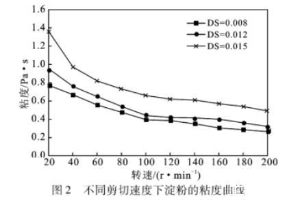 粘度是反映液體流變性能最常用的指標(biāo),粘度越小其流變性越高。由圖2可知,在同一轉(zhuǎn)速下,隨著取代度的增加,棕櫚酸酯淀粉糊液粘度升高;隨轉(zhuǎn)速增大,粘度先急劇下降后逐漸趨向平緩。棕櫚酸酯淀粉糊液粘度隨剪切速率的增大而減小,呈現(xiàn)“剪切稀化”特性,屬假塑性流體。淀粉糊液“剪切稀化”的程度與分子鏈的長短有關(guān),高DS淀粉酯相對分子質(zhì)量較高,“剪切稀化”程度也較大。淀粉糊液表觀粘度隨著剪切速率的增大而降低,表明淀粉凝膠網(wǎng)絡(luò)體系中分子間或分子內(nèi)的作用力(氫鍵)在較高的剪切速率下更容易被破壞。當(dāng)剪切速率繼續(xù)增加到淀粉分子纏結(jié)點、范德華力作用點被破壞完全來不及重建時,淀粉糊液表觀粘度趨于最小值。