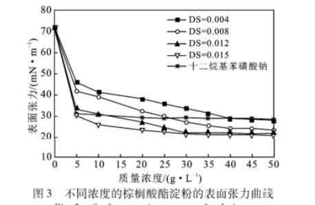 不同DS不同質(zhì)量濃度的棕櫚酸酯淀粉具有不同的表面張力,DS越高、質(zhì)量濃度越大,其表面張力越低,DS越高的淀粉其表面張力趨于穩(wěn)定的濃度越低,即臨界膠束濃度(cmc)越低。臨界膠束濃度(cmc)是表面活性劑的重要特征參數(shù),cmc越低的表面活性劑的效率越高。實驗范圍內(nèi)的棕櫚酸酯淀粉具有較高的表面活性,可作為表面活性劑應(yīng)用。