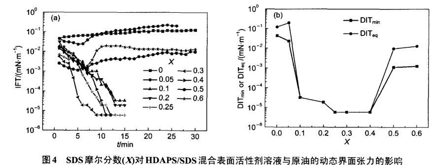 圖4 SDS摩爾分?jǐn)?shù)(X)對(duì)HDAPS/SDS混合表面活性劑溶液與原油的動(dòng)態(tài)界面張力的影響