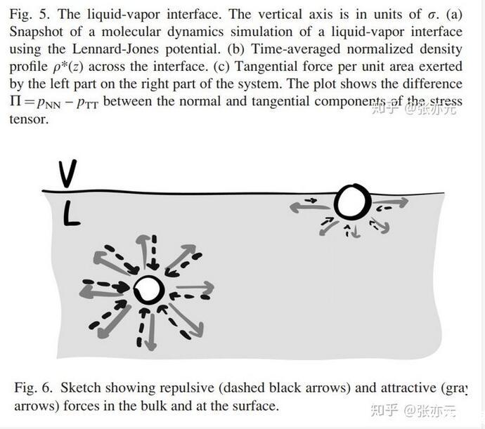 當(dāng)分子間距較小時,斥力為主,分子間距較大時,引力為主。在斥力與引力平衡時,Lennard-Jones勢能最小?,F(xiàn)在,我們就可以來詳細(xì)地考慮液-氣界面了。圖5a是通過分子動力學(xué)仿真得出的液-氣界面照片,對應(yīng)的時間平均密度分布圖是圖5b。從高密度的液體到低密度的氣體發(fā)生在一個幾個分子厚度的窄區(qū)域。為了確定毛細(xì)力,我們沿垂直界面方向?qū)⑾到y(tǒng)分為兩個子系統(tǒng)(圖5a)??紤]左邊子系統(tǒng)對右邊子系統(tǒng)的單位面積的作用力,即應(yīng)力,在豎直方向上的分布。這個力有兩個來源:壓力P和額外壓力Π(圖5c)。圖5c表明有個力局部存在于界面附近,其實這個力就是表面張力,且這個力范圍和密度突變的范圍很相似。這說明表面張力的確是一個真實的力,而不僅僅是表面能的一種純數(shù)學(xué)描述。既然我們發(fā)現(xiàn)在界面附近的確局部存在一個平行的力,那我們回到問題1,為什么表面張力平行于界面而不是垂直于界面?我們注意到圖1僅僅描繪了分子間引力作用。更全面的圖應(yīng)該如圖6所示,包含了引力與斥力作用。在遠(yuǎn)離界面的液體本體內(nèi),由于液體分子周圍的完全對稱性,分子的受力完全平衡。但是,靠近界面附近的地方,上下對稱性被打破。為修復(fù)豎直方向的力平衡,向上的斥力需平衡向下的引力。而在平行于界面的方向,對稱性仍然存在,平行于界面方向的力平衡仍然存在。這就可以存在一種情況,引力作用的強度與斥力作用的強度不同。實際上,在界面附近的水平方向上,引力作用比斥力更強,這產(chǎn)生了表面張力。