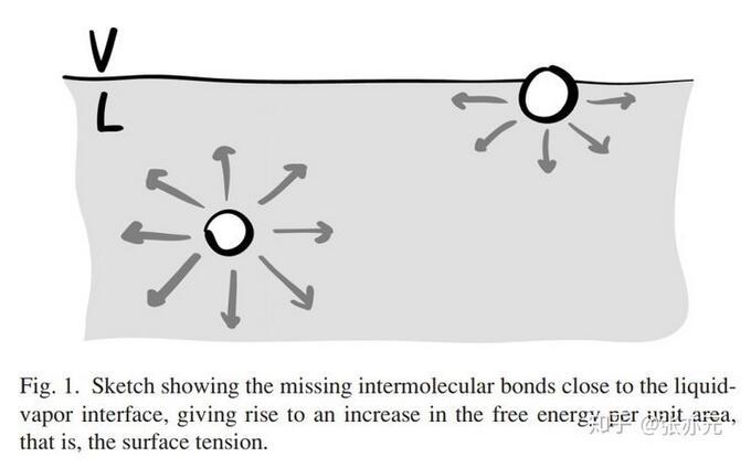 借鑒Gibbs的開創(chuàng)性工作,我們可以將表面張力理解成因兩本體相間界面存在導(dǎo)致的額外表面能。液-氣界面附近的液體分子所處的環(huán)境與本體中的分子不同,這種差異經(jīng)常被人用圖1的示意圖表現(xiàn),即近乎一半的分子間引力缺失,這導(dǎo)致自由能的增加,這是熱動力學(xué)的觀點。