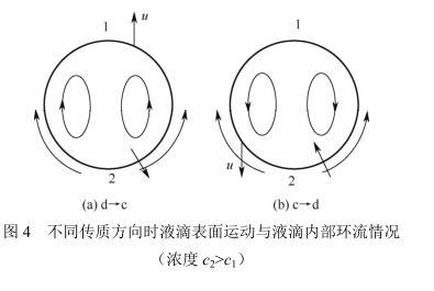 傳質(zhì)方向?qū)Ψ稚⑾鄿媛实挠绊懯怯捎贛arangoni效應(yīng)影響液滴破碎和聚并引起的。圖2和圖3中傳質(zhì)方向為d→c的分散相滯存率遠高于傳質(zhì)方向c→d的,原因在于本實驗所用的正丁醇-丁二酸-水體系是界面張力隨濃度增加而減小的體系(即?γ/?c<0)。在?γ/?c<0體系的d→c傳質(zhì)過程中[如圖4(a)所示],界面張力梯度導(dǎo)致液滴表面的運動方向與液滴內(nèi)部環(huán)流方向相同,有利于液滴的破碎。而c→d的傳質(zhì)過程[如圖4(b)所示],界面張力梯度的方向不變,但液滴內(nèi)部環(huán)流方向卻恰好相反,內(nèi)部與外部兩種力量相互抵消,液滴相對較穩(wěn)定,破碎的概率大大減小。所以,d→c的分散相滯存率明顯高于相反方向。