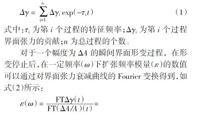 對于一個(gè)幅度為ΔA的瞬間界面形變過程,在形變停止后,在一定頻率(ω)下擴(kuò)張頻率模量(ε)的數(shù)值可以通過對界面張力衰減曲線的Fourier變換得到,如式(2)所示: